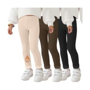 3 Pack Girls’ Fleece Lined Leggings, Winter Thermal Pants Tight Stretchy Full Length Pants for Kids Aged 3-11