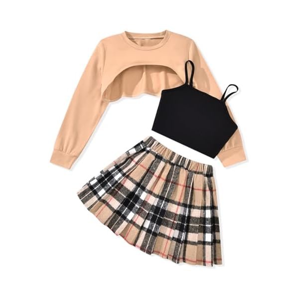 - EXQUISITE DESIGN: 3Pcs plaid skirt set for girls, the long sleeeve sweatshirt crop top and camisole perfect match, which feels soft, shiny, moisture-wicking and sweat-wicking. Classic crew neck sweatshirt and spaghetti strap tank top, matching with cute plaid pleated mini dress, which makes your little girl look pretty and adorable.