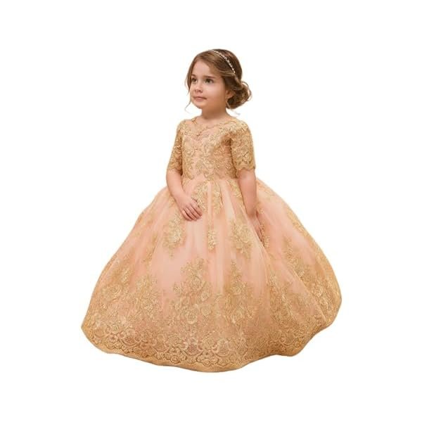 - Comfortable Fit: Designed with a soft blush pink base and overlaid with shimmering gold floral embroidery, this gown radiates elegance and sophistication. The half sleeves and illusion neckline create a classic silhouette, while the voluminous layered tulle skirt adds fairytale charm.
