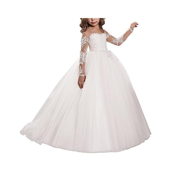 - Exquisite Design:A beautiful baby flower girl dress with lace bodice, tulle skirt and long sleeve. The skirt is decorated with a satin bow and magnificent detachable lace train.