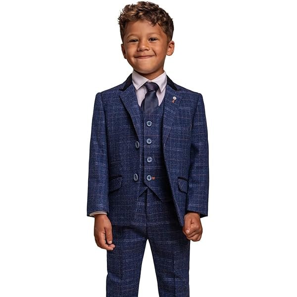 - A retro-styled tweet windowpane check suit in dark blue for boys is the perfect choice for any formal event.